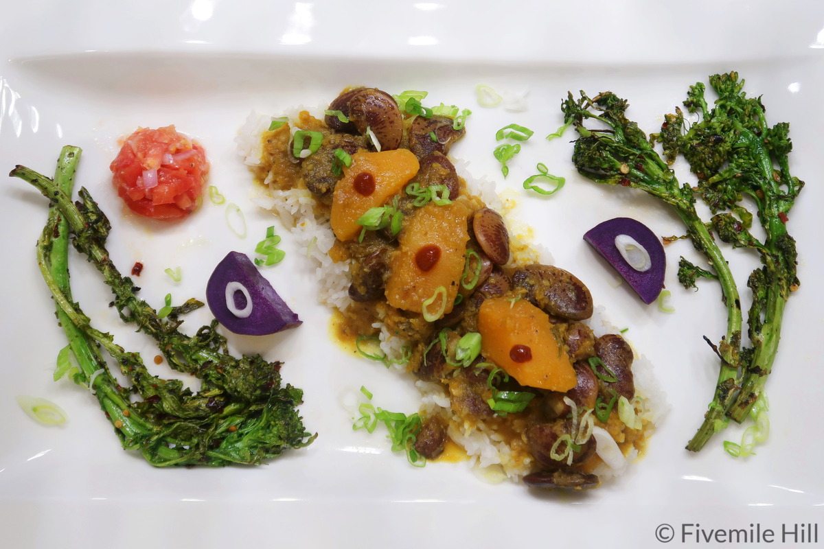 We take inspiration from this traditional plate to create a gourmet plants-only composition centered on beans. Cari pois citrouille is a traditional Réunion beans dish of white large lima beans (pois du Cap) and fresh pumpkin, with a ginger-turmeric sauce base. We adapted it to showcase different large lima beans, especially the colorful Christmas lima beans. We also replaced pumpkin with fresh butternut squash which retains its shape better during cooking.