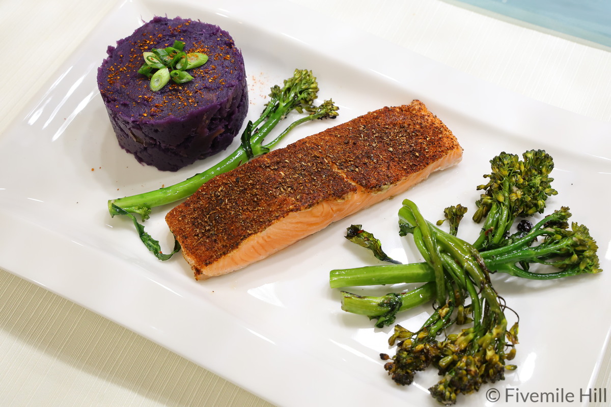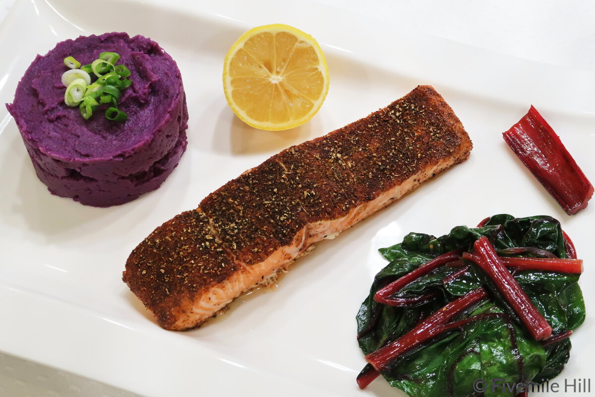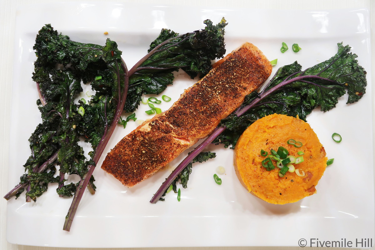 This composition exemplifies the marriage of ingredients from different cultures in one balanced composition. The Dijon mustard and garam masala rub combine harmoniously Eastern and Western spices to elevate the flavor of the salmon without overpowering it. The softness of the sweet-potato purée complements the tender salmon meat while its sweetness balances the exotic spices, spicy kale, and lemon drizzle.