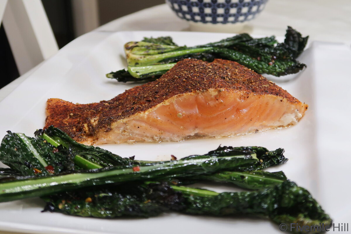This composition is ideal to showcase excellent fresh Chinook salmon that was never frozen. The salmon here is not fully cooked, so freshness is essential for food safety. In addition, it is difficult to achieve a glassy meat texture with previously frozen salmon.