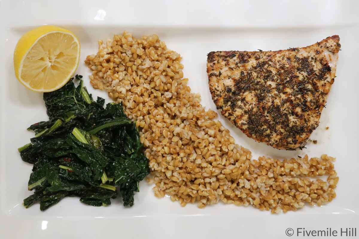 The bold taste and ocean fragrance of swordfish shines best when grilled simply over wood fire, a traditional way to cook fresh fish worldwide. The flavors of this open-ocean game fish transport us to a warm beach with golden sand and lush vegetation represented by einkorn farro and colorful chards.