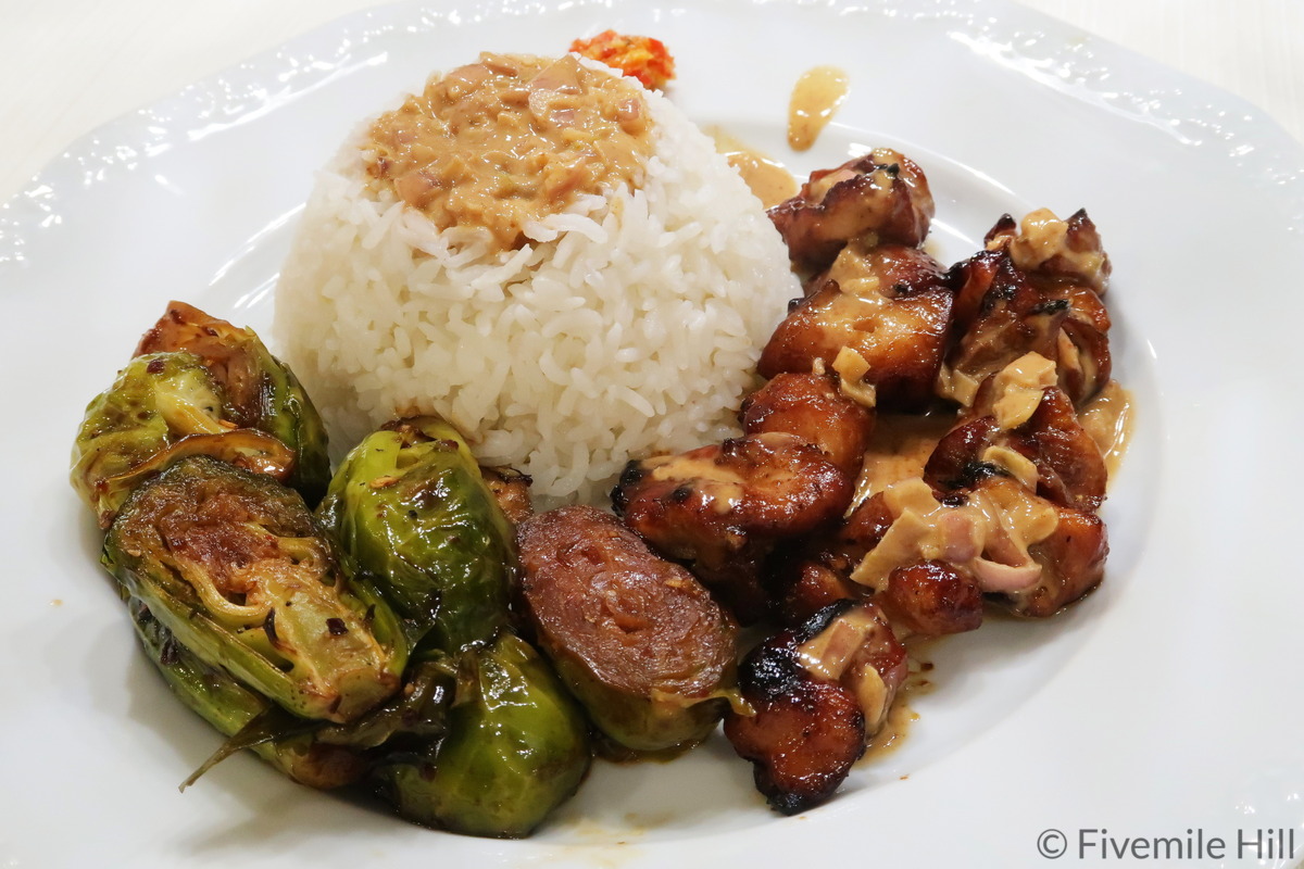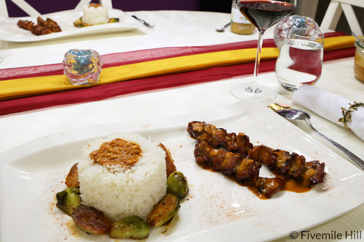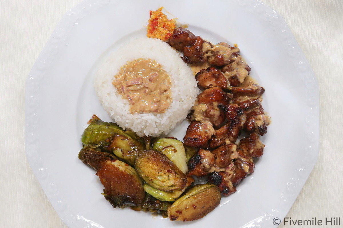 We savor the wonderful combination of chicken, wood-fire grilling, kecap manis (the unique Indonesian sweet soy sauce) and peanut butter in this quintessential Indonesian dish. We also marvel at the delicious marriage of Asian kecap manis with Western Brussels sprouts which creates a surprising yet harmonious multicultural plate.