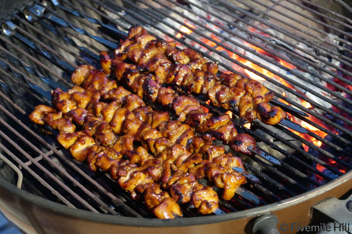 We grill the chicken skewers on wood fire over indirect heat. This enables us to baste the chicken skewers with the sweet marinade, without burning, while they are cooking. The regular basting and low heat also make it possible to keep the chicken meat wonderfully moist as it grills.